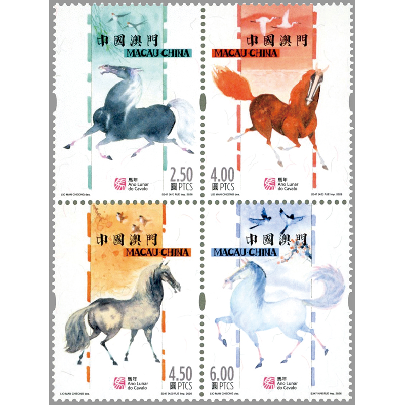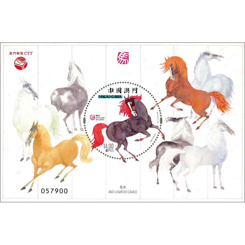 水墨画調で描かれた馬と四季の風景。小型シートは円形切手を収める。