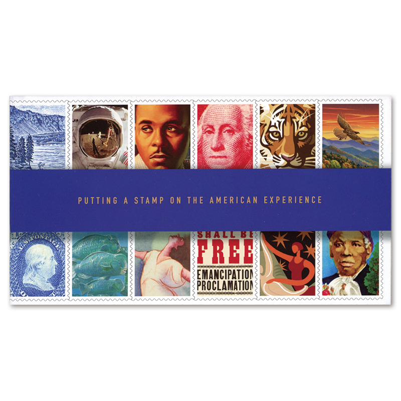 アメリカ郵政250年記念。32ページ建て冊子型の特別切手帳。1847年発行の一番切手、ベンジャミン・フランクリンの5セント切手を元に、アメリカ独立100年記念万博(1875年)のために制作された公式複製品をデザイン(刷色赤茶→青に変更)した無額面(Forever)セルフ糊切手の10枚ペーン2枚と、アメリカ切手の歴史を綴る解説文とイラストページで構成。