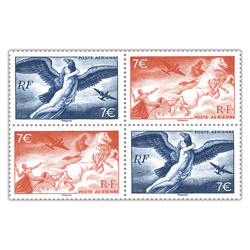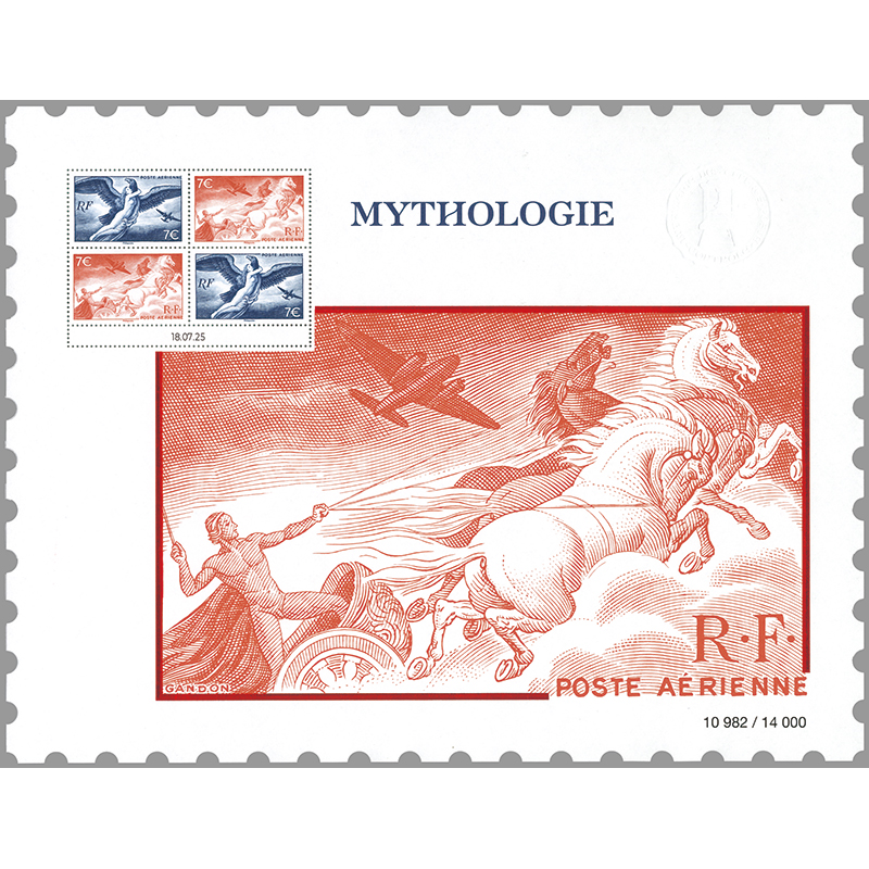 凹版。1947年に発行された航空切手/神話シリーズからピエール・ガンドンによるデザイン・彫刻の2種(「ゼウスに攫われるアイギーナ」「太陽の戦車を操るアポロ」)を額面を変更して復刻再現。シートサイズ:286×220ミリ。