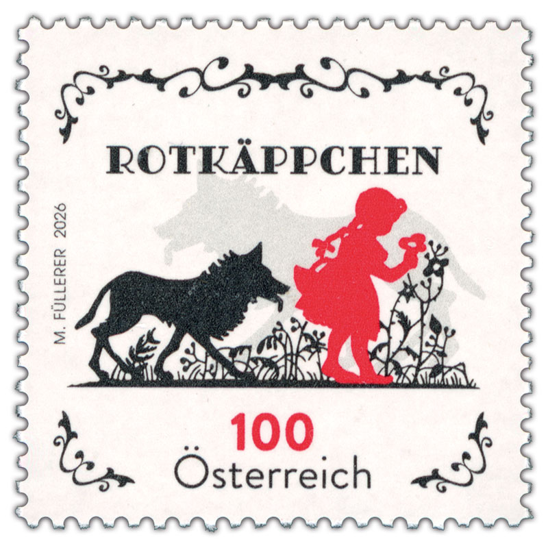 切手は、赤ずきんとオオカミの劇的な遭遇のシーン。グリム童話(1911年出版)の黒いシルエットアート(影絵)の挿絵の一部(赤ずきん)を赤へ変更。