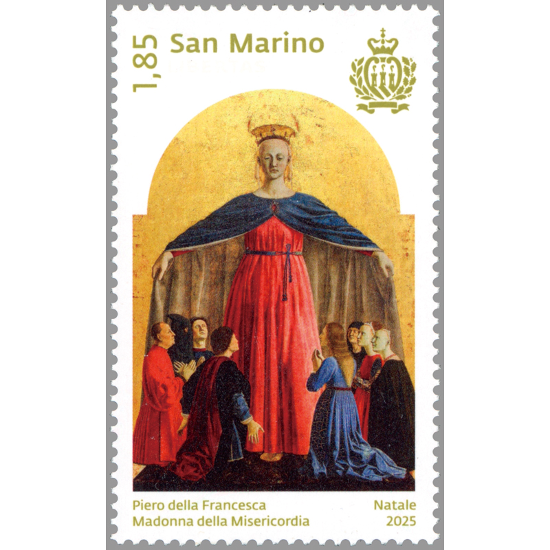 イタリア初期ルネサンスを代表するウンブリア派の巨匠ピエロ・デラ・フランチェスカ(1412〜92)がサンセポルクロのミゼリコルディア(慈悲)同信会から依頼を受けた祭壇画の中央パネル。マントを広げた聖母が信者たちを保護する図像が遠近法や明瞭な色彩、秩序高い空間構成で描かれている。