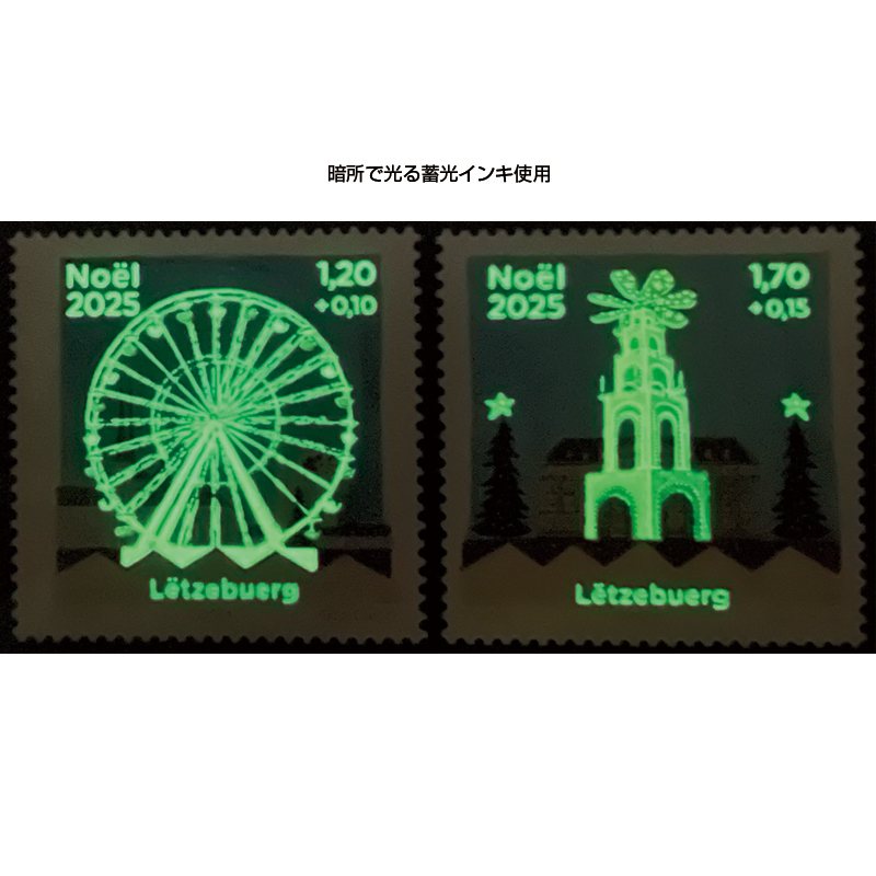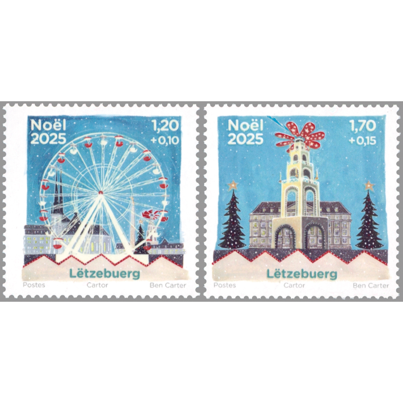 クリスマスマーケットの象徴的なモチーフを描く。憲法広場の巨大観覧車、エッシュ・シュル・アルゼットのクリスマスピラミッド。