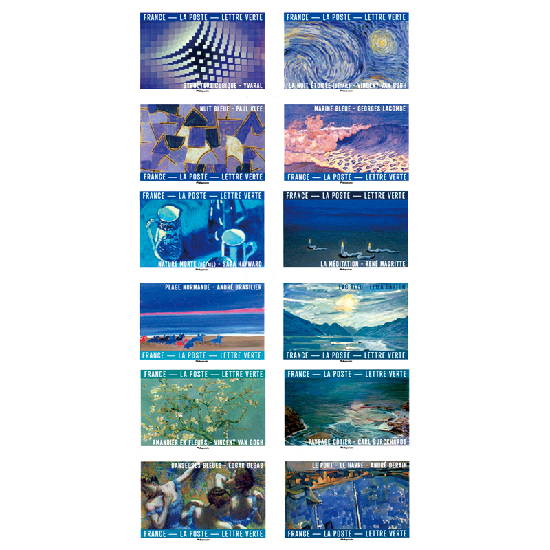 ●イヴァレル「立方体構造」、ゴッホ「星月夜」、パウル・クレー「青い夜」、ジョルジュ・ラコンブ「マリンブルー 確かな波」。