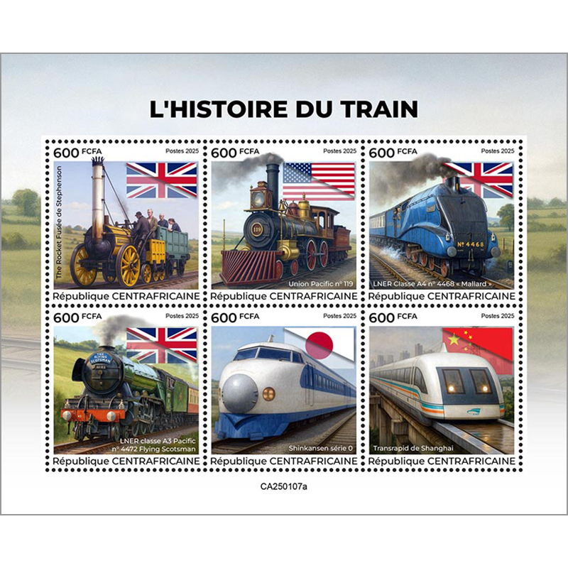 世界初の旅客鉄道「ロケット号」(英)、大陸横断鉄道開通時の「ユニオンパシフィック119号」(米)、世界最高速度を記録した蒸気機関車「マラード号」(英)、急行旅客用 LNER A3形蒸気機関車4472号機「フライング・スコッツマン」(英)、世界初の高速列車「新幹線0系」(日本)、超高速磁気浮上式リニア「上海トランスラピッド」(中国)。