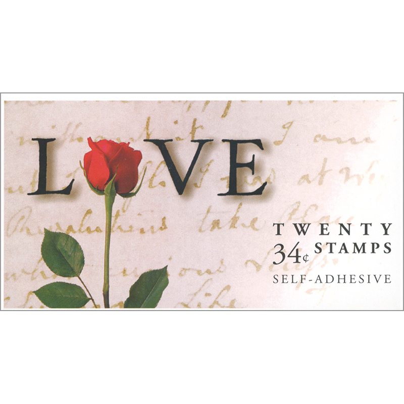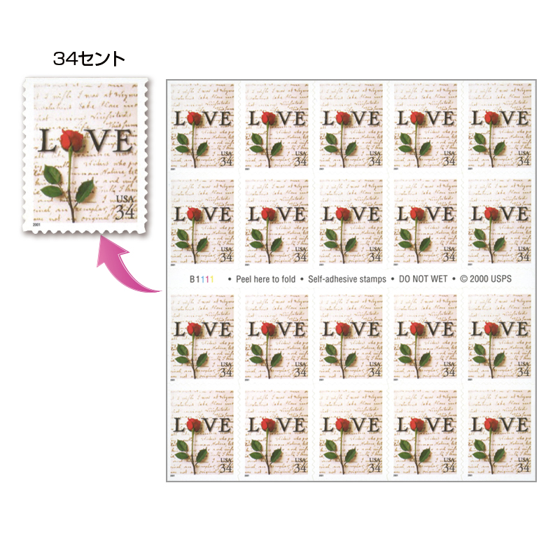 バラと「LOVE」の文字が図案の34セント切手20枚を収める。