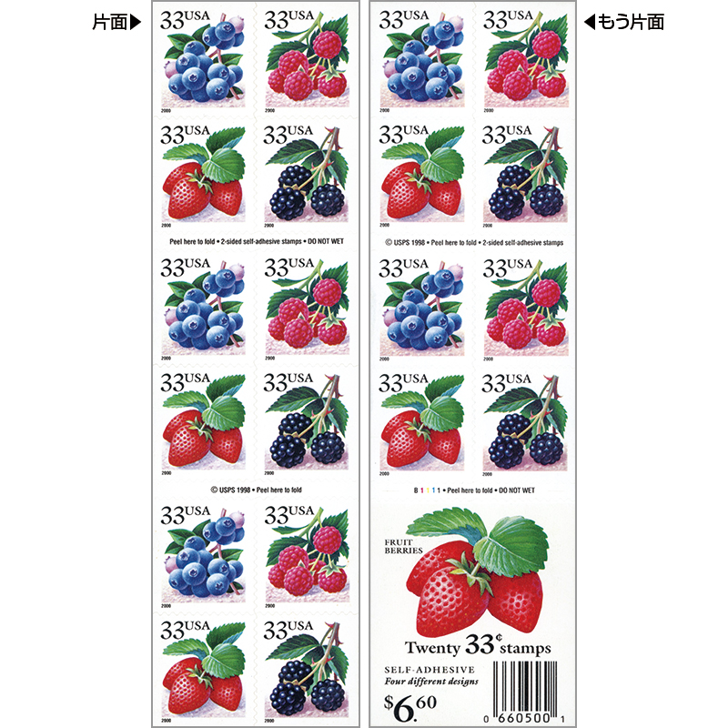 ブルーベリー、キイチゴほかを描く4種20枚を表裏合わせて収める。この図案の切手には図案内の年号が「1999」のものと「2000」のものが存在する。ここに案内するものは、「2000」のもの(発行は1999年)。