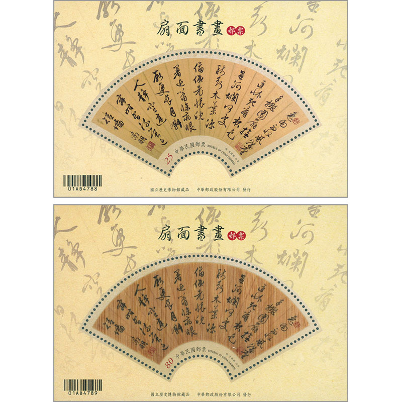 中国明代中期の画家・書道家である文徴明による行草書体の書が図案の扇形切手を収める。2種のうち1種は、図案を印刷した扇形の竹片を印面に貼付している変わり種切手。