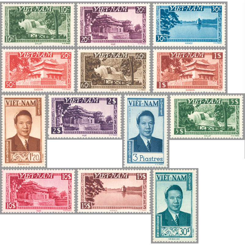 フエの皇帝宮殿(「フエの建造物群」はベトナムの世界遺産)、バオ・ダイ皇帝、ダラットの滝、ハノイの湖、サイゴンの寺院が図案。図案は5種で、他は額面・刷色違い。