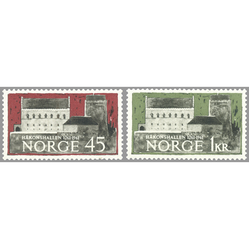 ノルウェーの世界遺産である「ブリッゲン」にあるホーコン王の館を描く。同図案、額面・刷色違い。