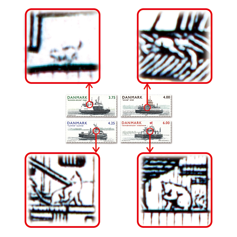 4種ともに、フェリーを描く。描かれたフェリーの上には、いずれも肉眼では認識しづらいほどの大きさでネコが描かれており、超絶マイクロプチ猫切手としても知られる。