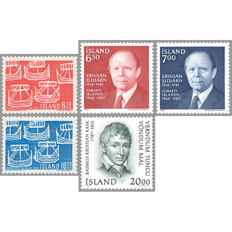 古代の船のデザイン、言語学者ラスクの肖像ほかが図案。図案は3種で、他は額面・刷色違い。