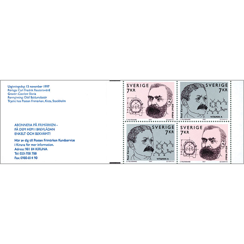 アルフレッド・ノーベル、ポール・カーラーの肖像が図案の2種を2組収める。スラニアによる彫刻凹版切手。