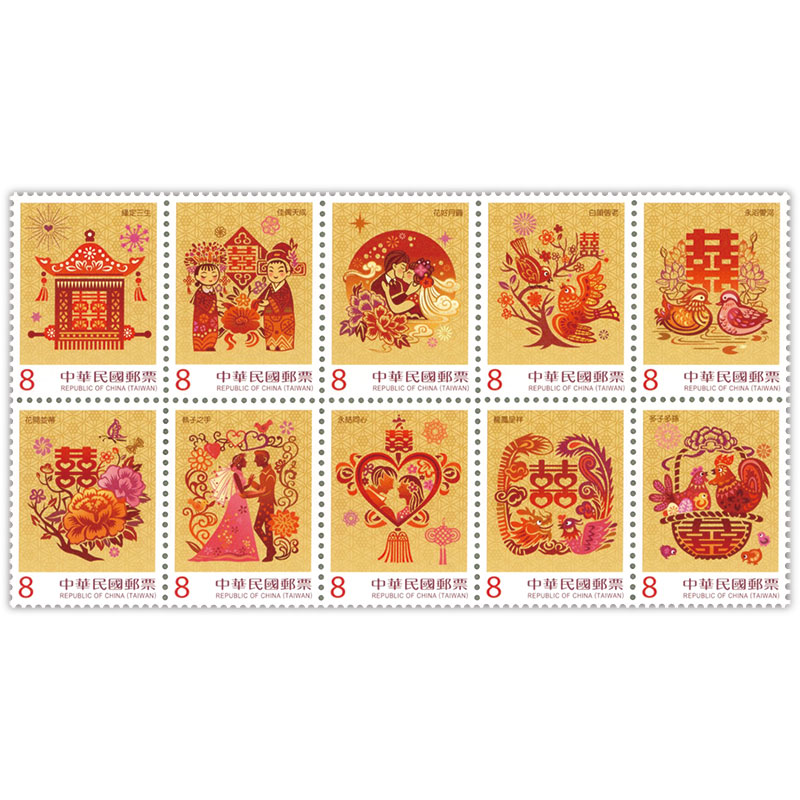 10種連刷同士で互いに同図案、額面・刷色違い。「佳偶天成」「執子之手」「多子多孫」ほか、幸福をイメージさせる言葉をモチーフにした図案。