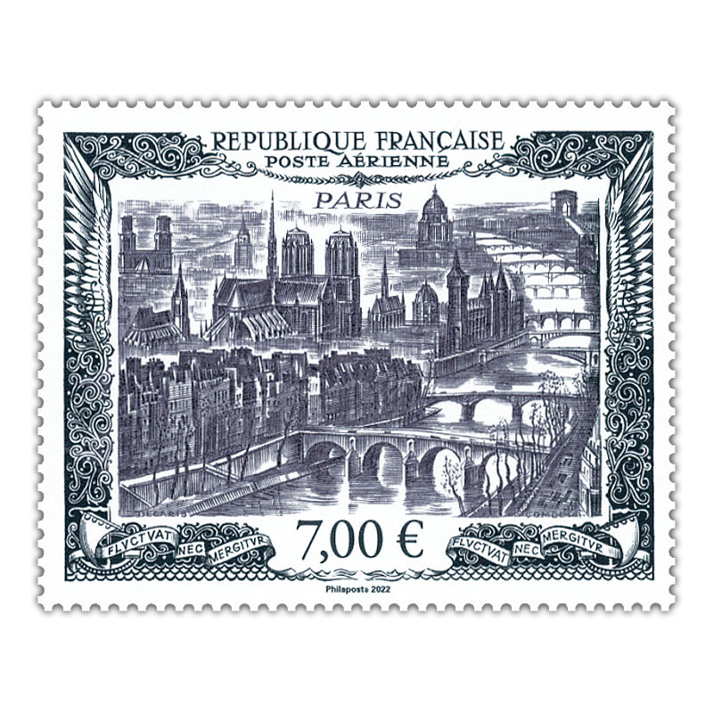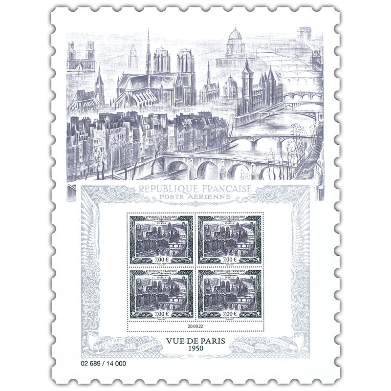 1950年発行の航空切手(「大都市シリーズ」よりパル1000フラン)をもとにした切手4枚を田型で収める。14000シートの限定発行。