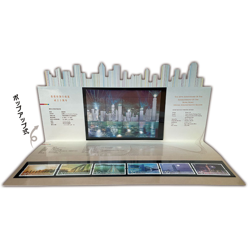 ポップアップ式。小型シートは、香港上海銀ほかを描くホログラム切手3種を連刷で収める。