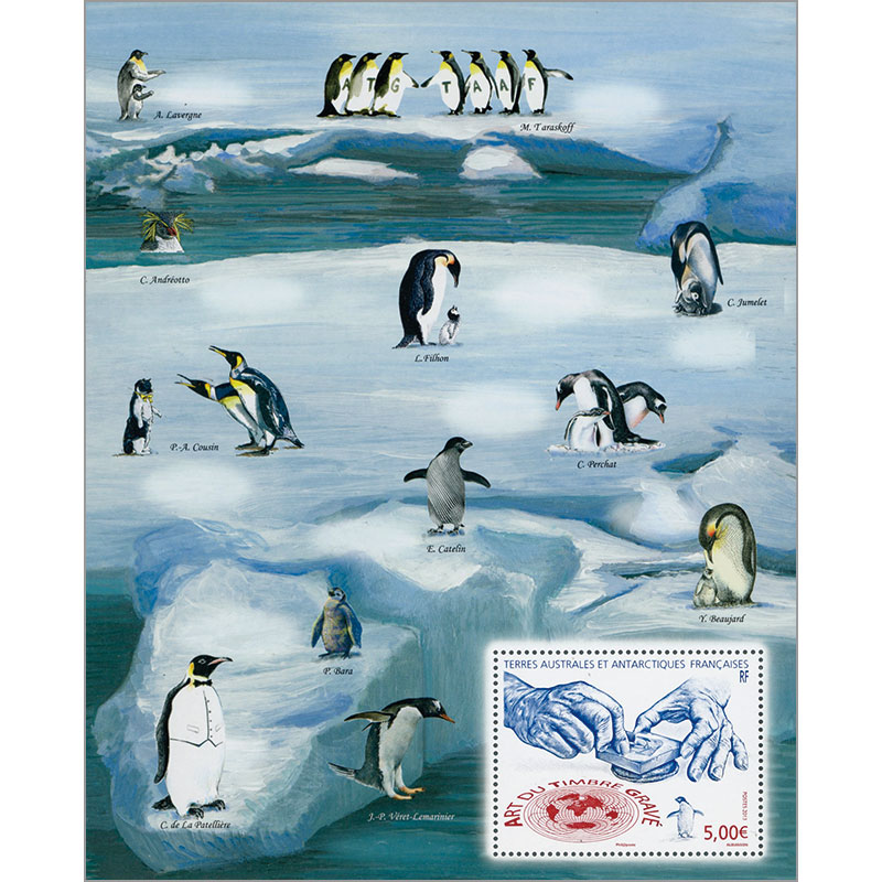 ビュラン(彫刻刀)による凹版の原版作成の様子とペンギンほかを描く1種を収める。シート地にペンギンほか。