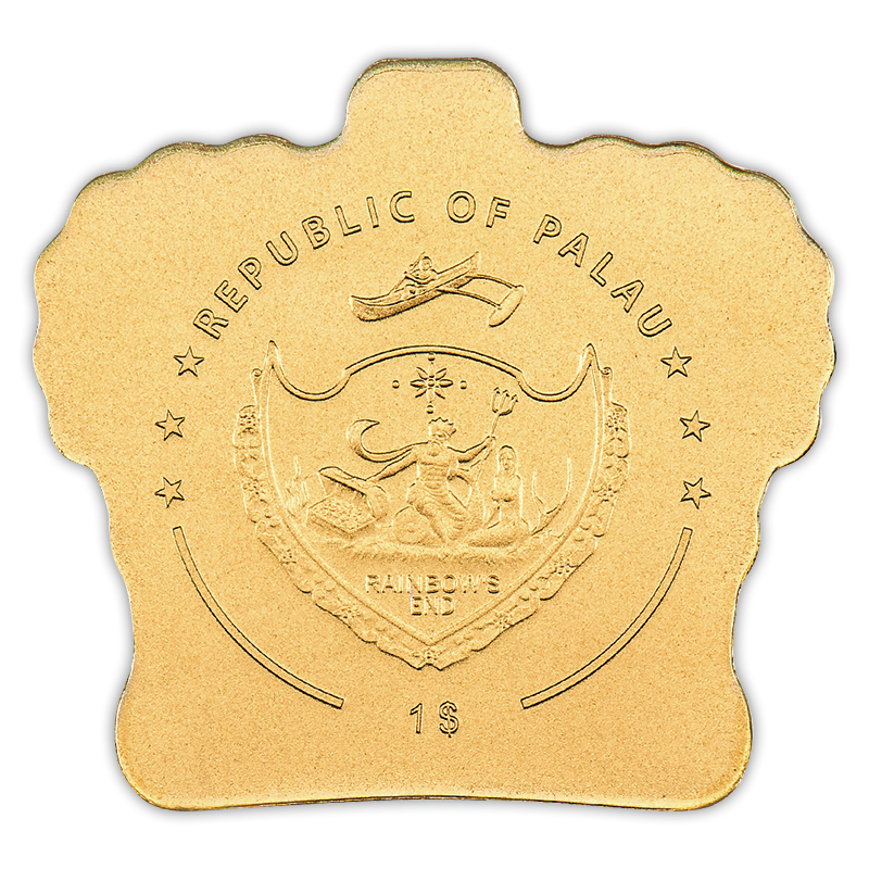 古代において王冠は、武勇に報いる褒賞として、あるいは名誉と支配の証として用いられました。現在も英国をはじめ、一部の国では、王冠は宮廷儀礼の一部を担っており、見る者を魅了しています。コインは王冠の形に象られており、各部の装飾まで表現したデザインが印象的です。