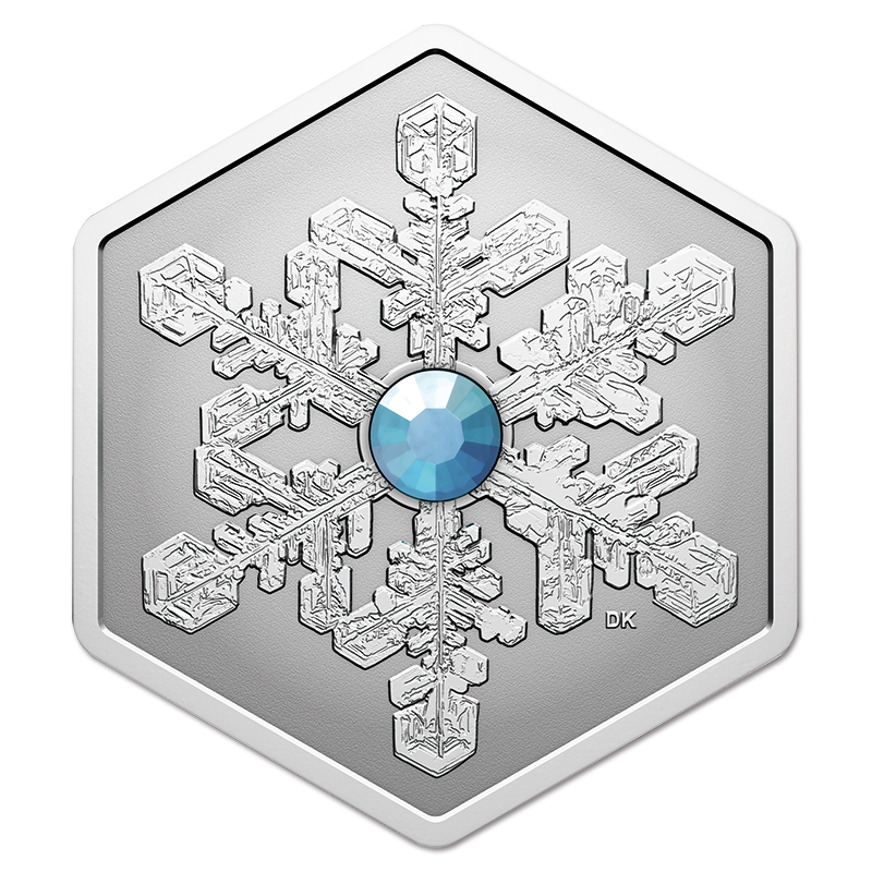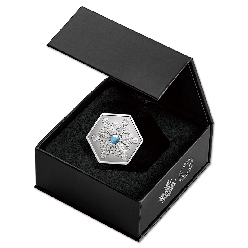 シリーズ第2弾となるコインの裏面には、雪の結晶の代表的な形といえる星のような樹枝状結晶をデザイン。幻想的なシンメトリーをした六角形の中央に、アイスブルーのクリスタルが嵌め込まれ、降り積もったばかりの雪の輝きを連想させます。