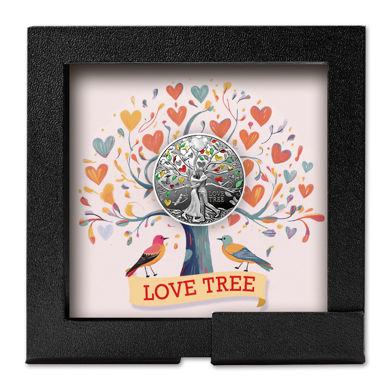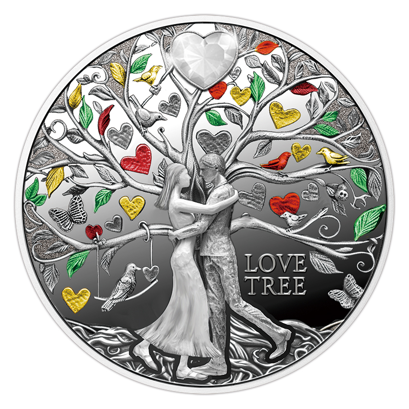 “ラブ・ツリー”(愛の樹)という名の本コインは、愛の多様性と美しさを象徴するエレガントなコインで、上方にはハート型のクリスタルが嵌め込まれています。
