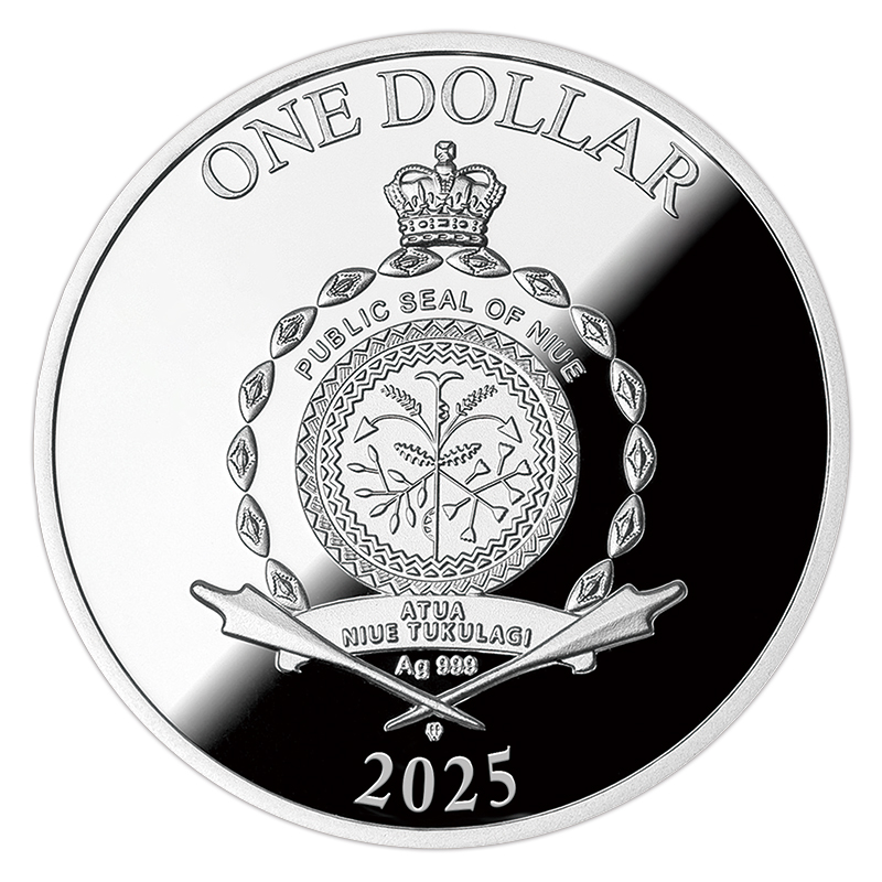 表面は、発行国ニウエの国章と発行年「2025」を刻印。