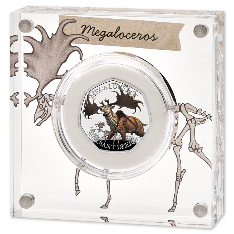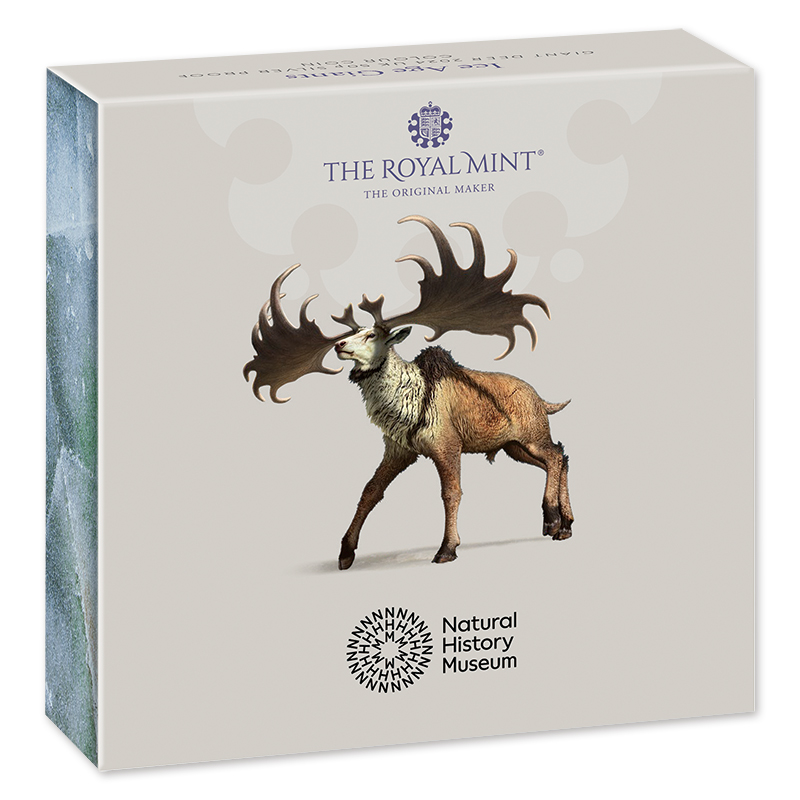 コイン裏面には、古生物学者エイドリアン・リスター教授の専門的指導のもと、古生物画家ロバート・ニコルズが手掛けた迫力たっぷりのギガンテウスオオツノジカの姿が再現されています。