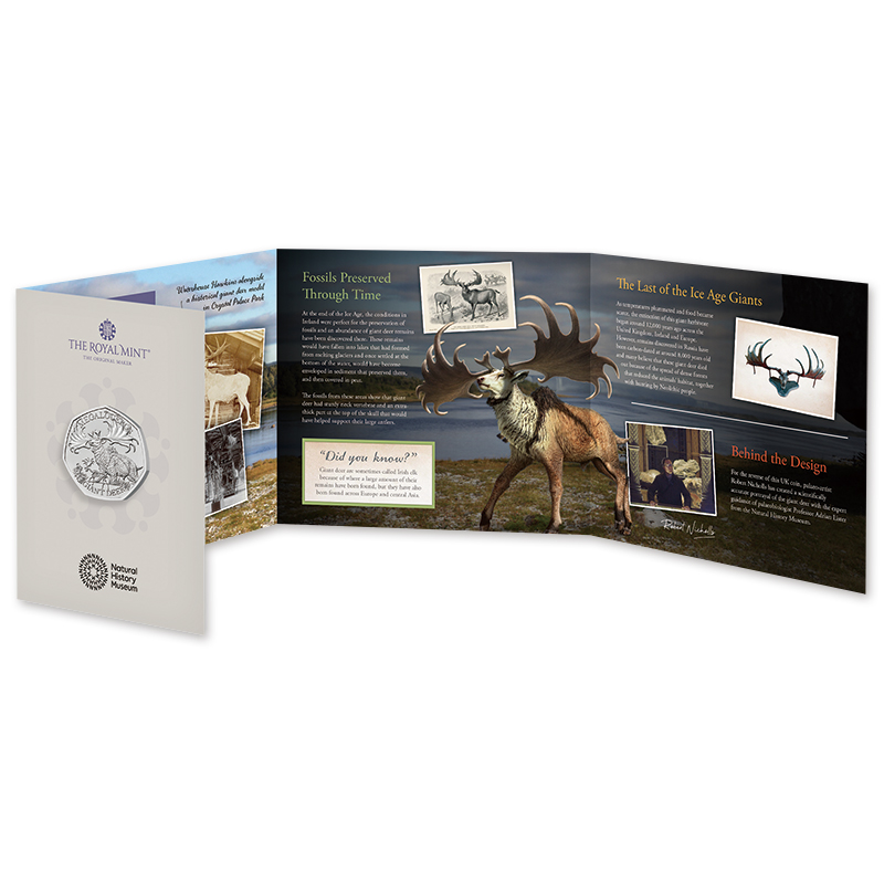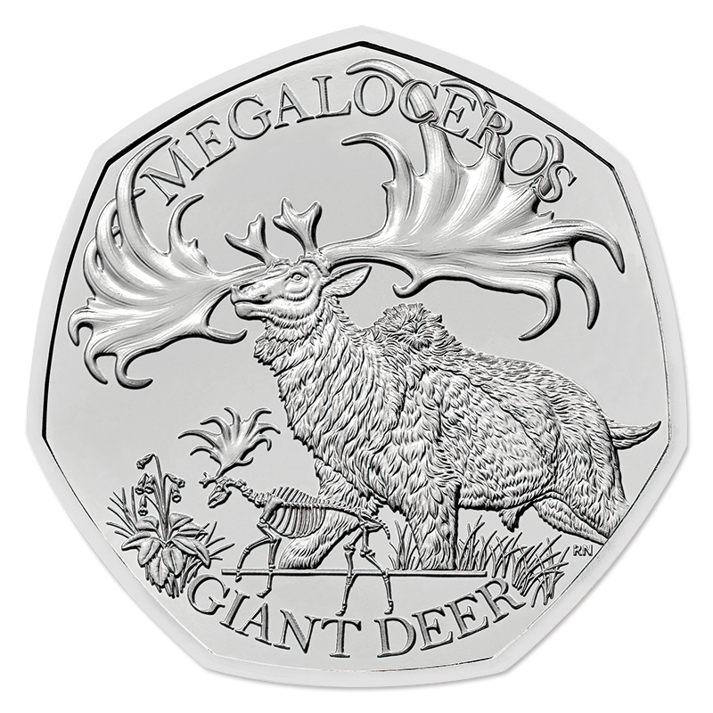 コイン裏面には、古生物学者エイドリアン・リスター教授の専門的指導のもと、古生物画家ロバート・ニコルズが手掛けた迫力たっぷりのギガンテウスオオツノジカの姿が再現されています。