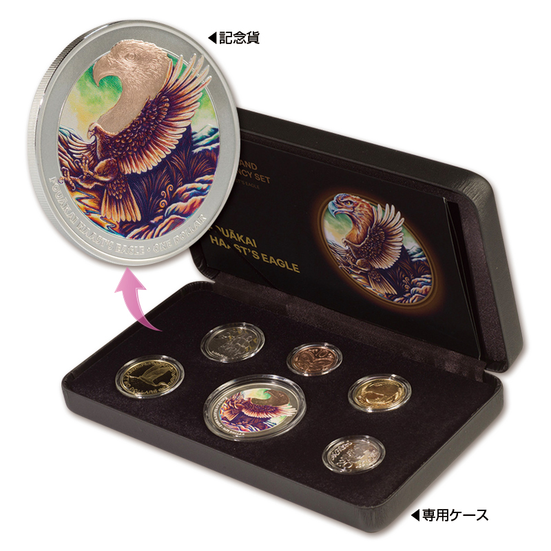 ニュージーランドを象徴するお馴染みのデザインを刻んだプルーフ仕上げの通常貨5種に加え、当セットでしか入手できない、ハーストイーグルを金メッキと美しい彩色を施して描いた、1オンス銀貨が含まれています。