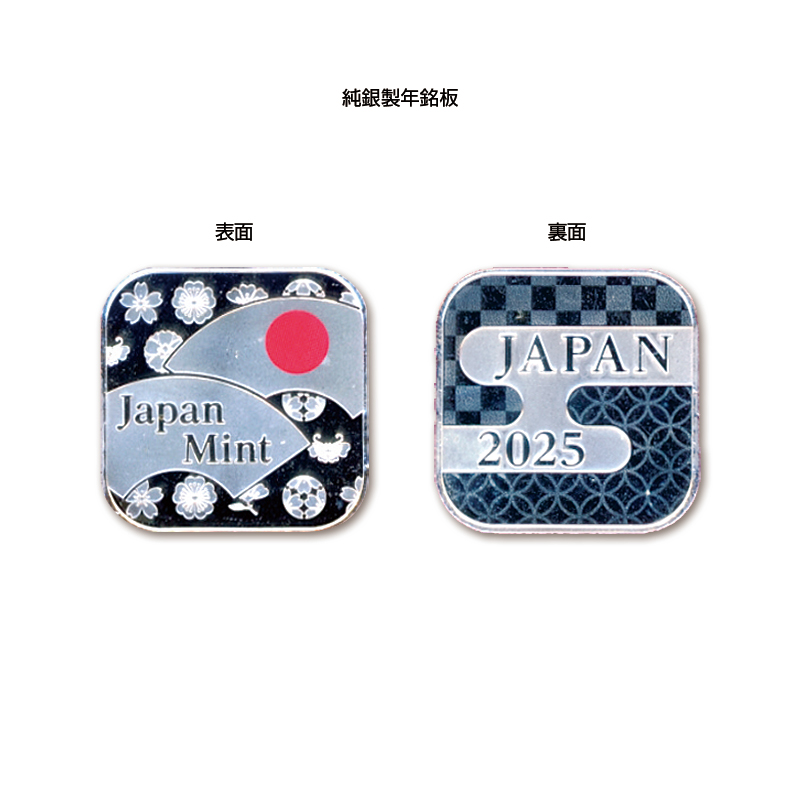 年銘板の表面には、桜の様々な伝統紋様を背景に、日の丸とJapan Mintの文字を扇の中にデザインし、裏面には虹色発色加工技術で表現した市松紋様・七宝繋ぎ紋様を背景に、西暦とJAPANの文字をヱ霞文様の中に配しています。