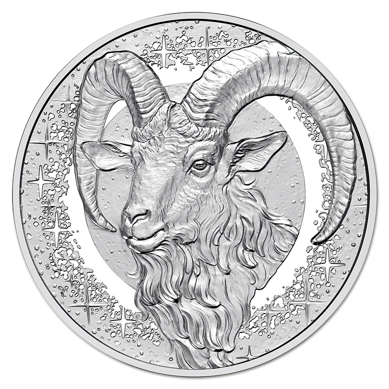 コイン裏面の中央には、ヤギの仲間のアイベックスをデザイン。周りを囲む円は、外側に向かって、煌めく星々に溶け込んでいます。