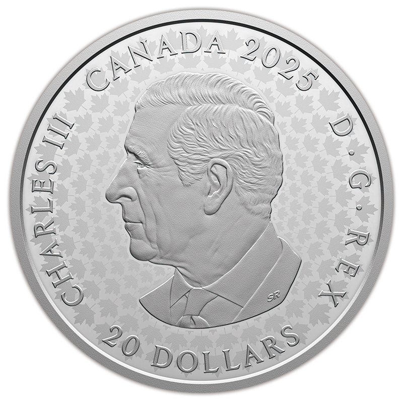 表面は、国王チャールズ3世の肖像。背景に敷き詰められたメイプルリーフのパターンが印象的です。