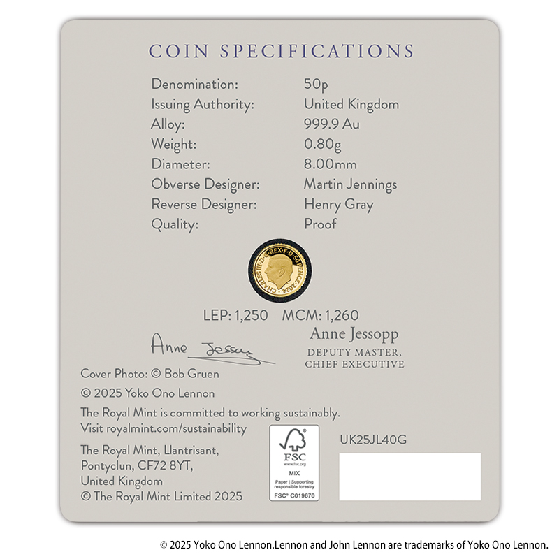 音楽史上屈指のバンドの設立メンバーであり、自らも優れた演奏者だったジョン・レノンの音楽キャリアは、音楽業界にとどまりません。ジョンの歌とイメージは、時代を超越しており、その影響力の大きさは否定しようがありません。活動家、公民権運動家、平和活動家の象徴として、世界の問題に対するジョンの姿勢は、一つの世代の心を動かし、周囲の人々だけでなく、歴史そのものにも足跡を残し、世界中の人々の生活に影響を与えました。英国王立造幣局は、この象徴的なアーティストを記念して、素晴らしい遺産を称えるコインを発行しました。