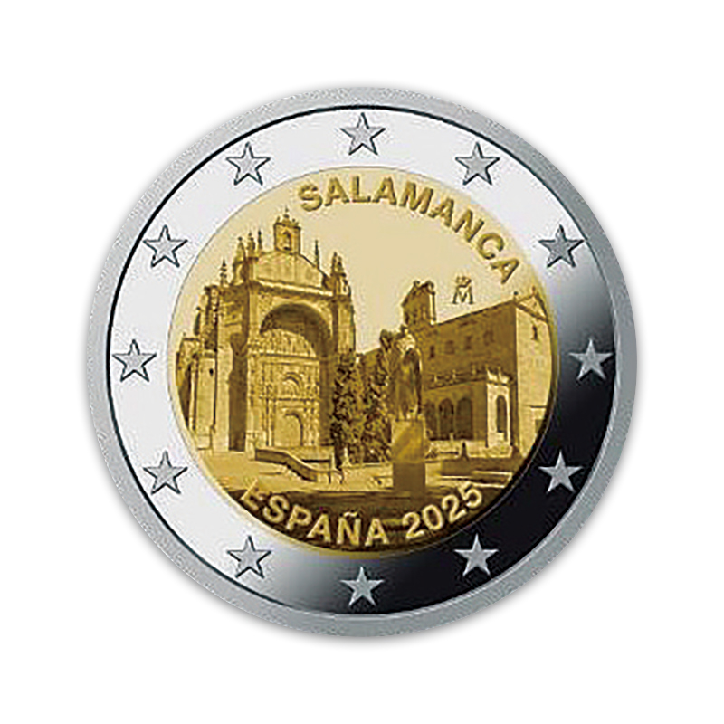 スペインの世界遺産を描く2025年銘の記念2ユーロ貨が、王立スペイン造幣局から発行され、マドリードの北西に位置するサラマンカ旧市街が取り上げられました。