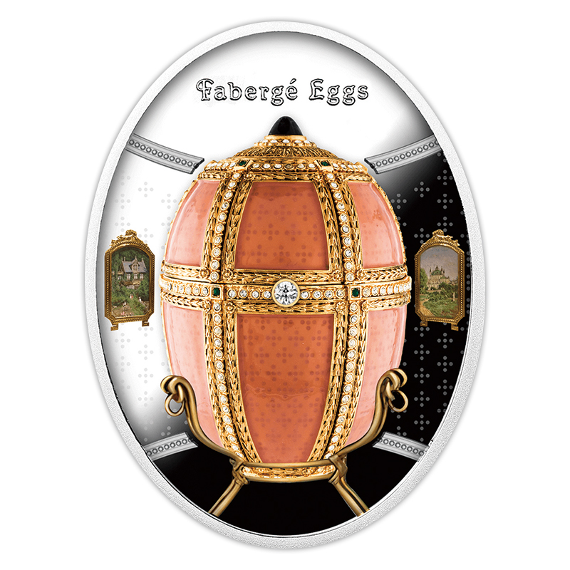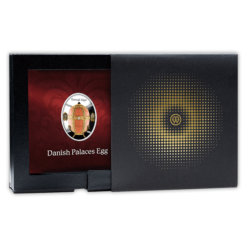 オリジナルのエッグは、皇后マリア・フョードロヴナの姪にあたるデンマークのダウマー女王の誕生を記念して制作されました。金、エナメル、ダイヤモンド、サファイア、エメラルドなどで装飾を施したエッグ内には、皇后が結婚前に暮らしていたデンマークの宮殿の様子を描きました。屏風のように連なる10枚のミニチュア水彩画が内蔵されています。コインには、そのうちの2枚の絵画が、エッグの左右に再現されています。