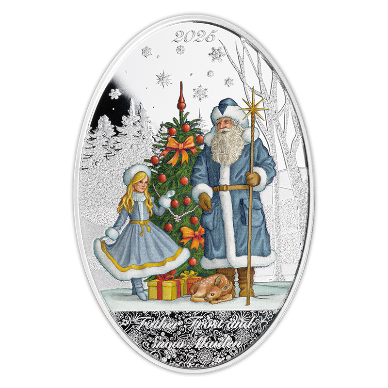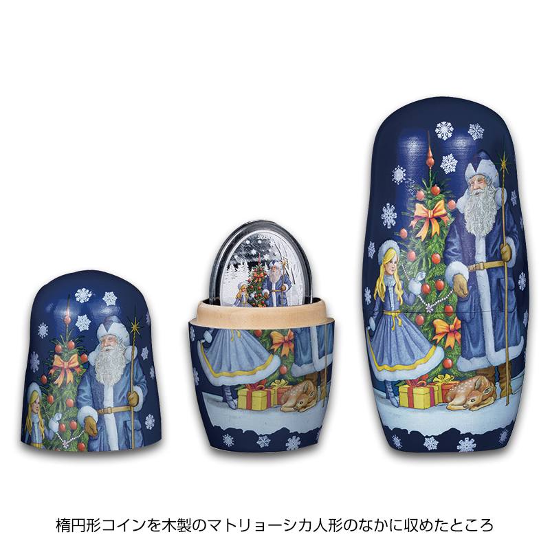 ロシア民謡のサンタクロース「ファーザー・フロスト」をモチーフとする楕円形コインを、木製マトリョーシカ人形のなかに収めた人気シリーズ。コイン一枚一枚にシリアル番号が刻まれています。