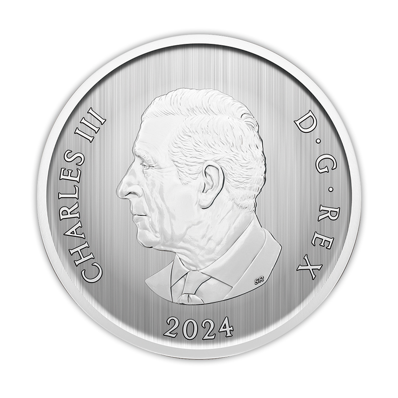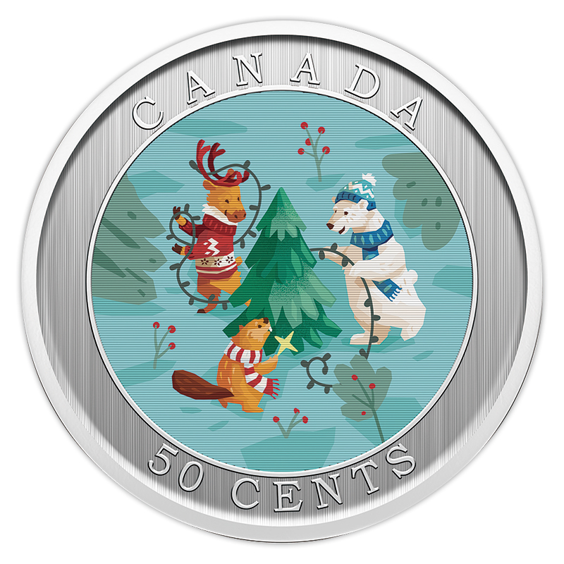 2024年銘は、冬のカナダにおけるホリデーシーズンの楽しげな場面が描かれています。裏面には、カナダの代表的な動物(ホッキョクグマ、トナカイ、ビーバー)が、クリスマスツリーの飾り付けをしている昼間の様子をデザイン。コインを傾けると、動物たちがプレゼントを交換するクリスマスイブの幻想的な夜のシーンへと変わります。