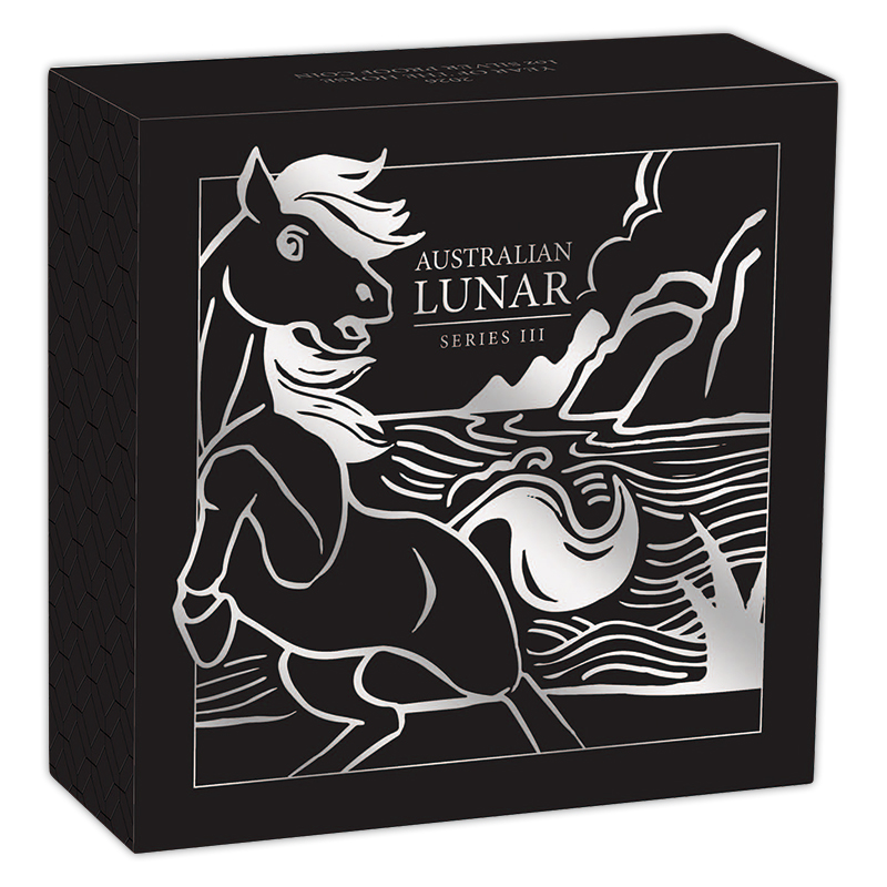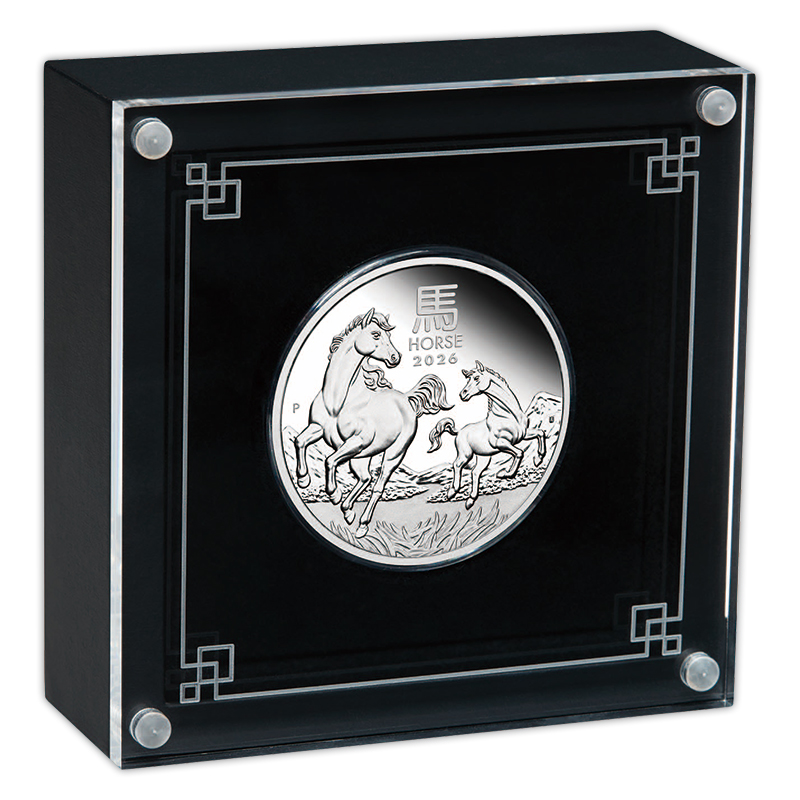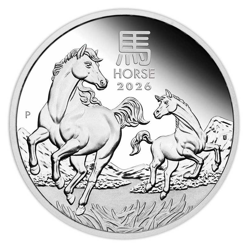 *「馬」の漢字、「HORSE 2026」の刻印、パース造幣局の「P」造幣局マークがデザインされています。
