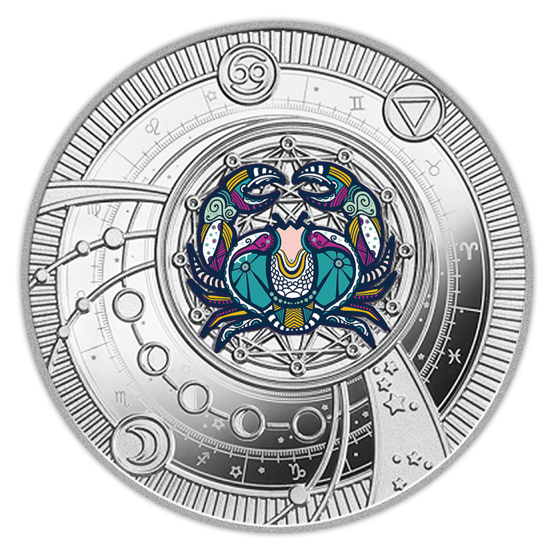 月が支配する、“水”のエレメントに属するかに座。この星座のもとに生まれた人は、感受性の高さと慈愛、感情的な絆の強さを持っているといわれます。コインには、かに座のシンボルがあしらわれており、直感と調和しながら生き、感情の安定を大切にする人たちにとって、深い象徴的な意味を持つ美の形状が表現されています。