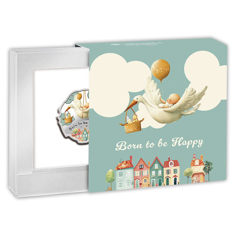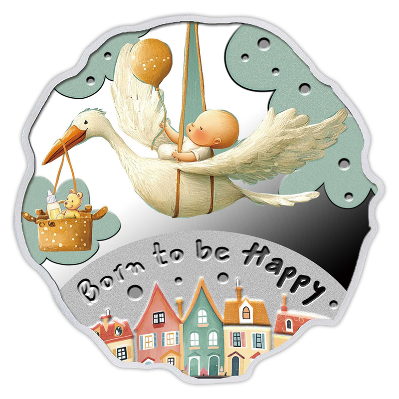 裏面には、ミルクや玩具などの贈り物が詰まったバスケットを携え、赤ちゃんを背中に乗せて運ぶコウノトリを柔らかい色彩で表現。小さな薄縁の雲に囲まれ、中央下に「Born to be Happy」(幸せになるための誕生)の銘を刻印。眼下にはパステルカラーの家が並び、赤ちゃんの到着を歓迎しているかのようです。