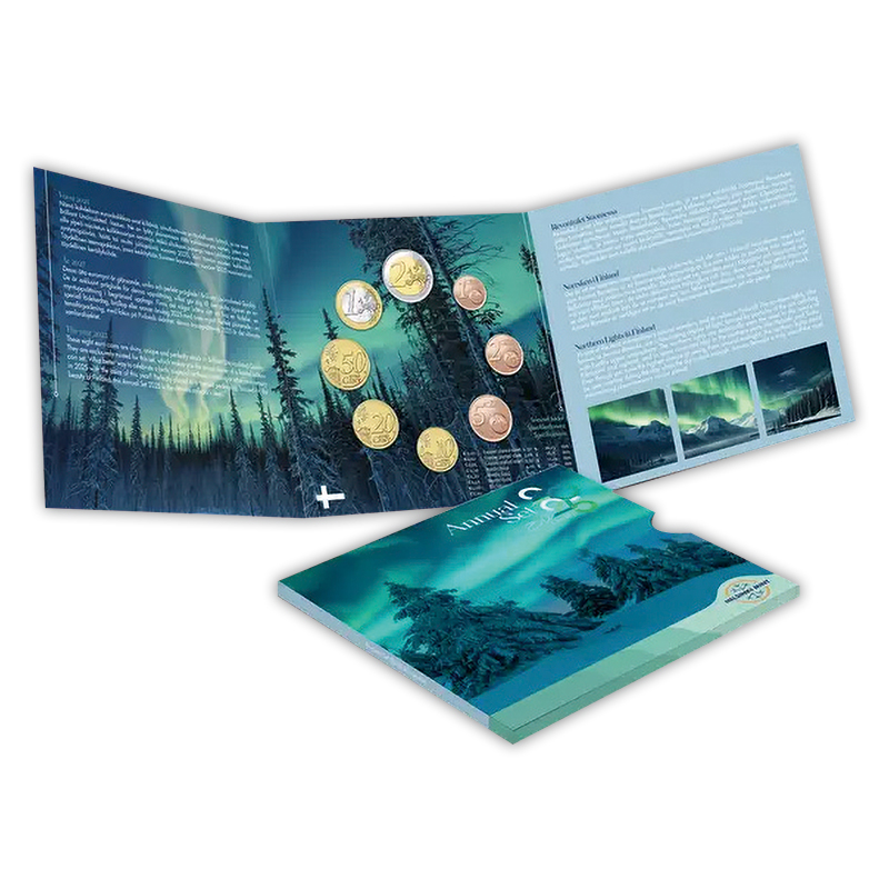 今回はオーロラに焦点を当てた素晴らしいパッケージに、2025年銘のフィンランドのユーロ貨が8枚収められています。