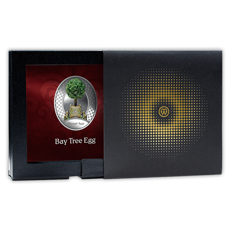 オリジナルのエッグは、ファベルジェが1911年に制作した月桂樹をモチーフとするイースターエッグ。ダイヤモンドやルビーなど多数の宝石と、エナメルで装飾されたネフライト製の葉325枚に金製の卵が包まれています。葉の間に隠された小さなレバーを操作すると、円形の蓋が開き、小鳥が現れて歌を歌うという精緻な仕掛けが施された芸術品です。現在はサンクトペテルブルクのファベルジェ博物館で展示されています。