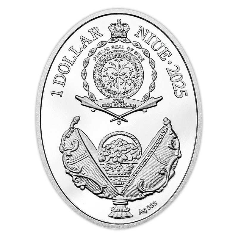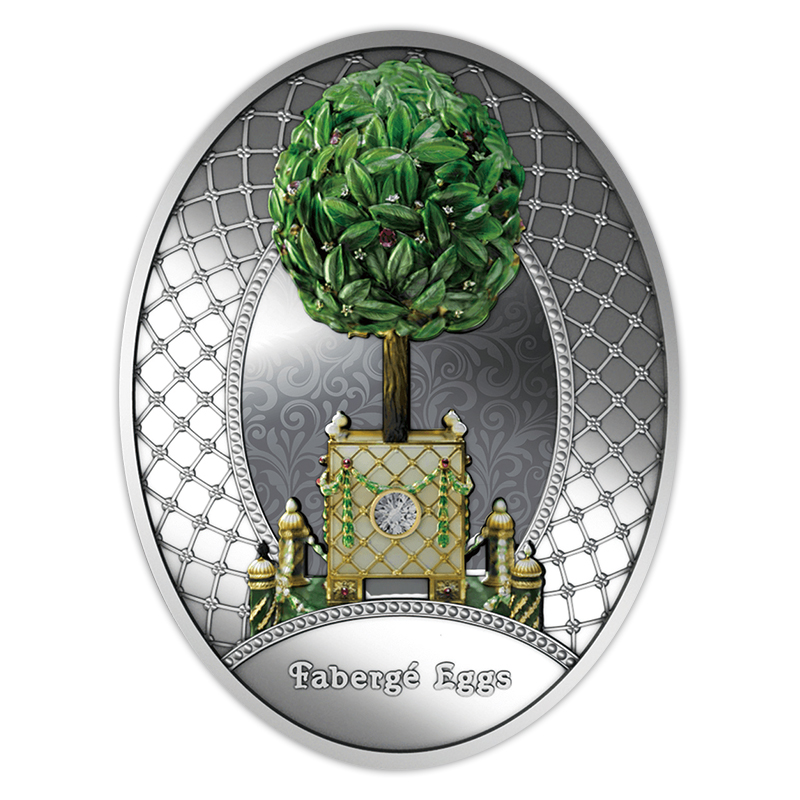 ロシア最後の皇帝ニコライ2世が母マリア・フョードロヴナに贈った「ベイツリー・エッグ」。裏面に嵌め込まれたクリスタルが、コインの優雅な魅力を一層引き立てています。