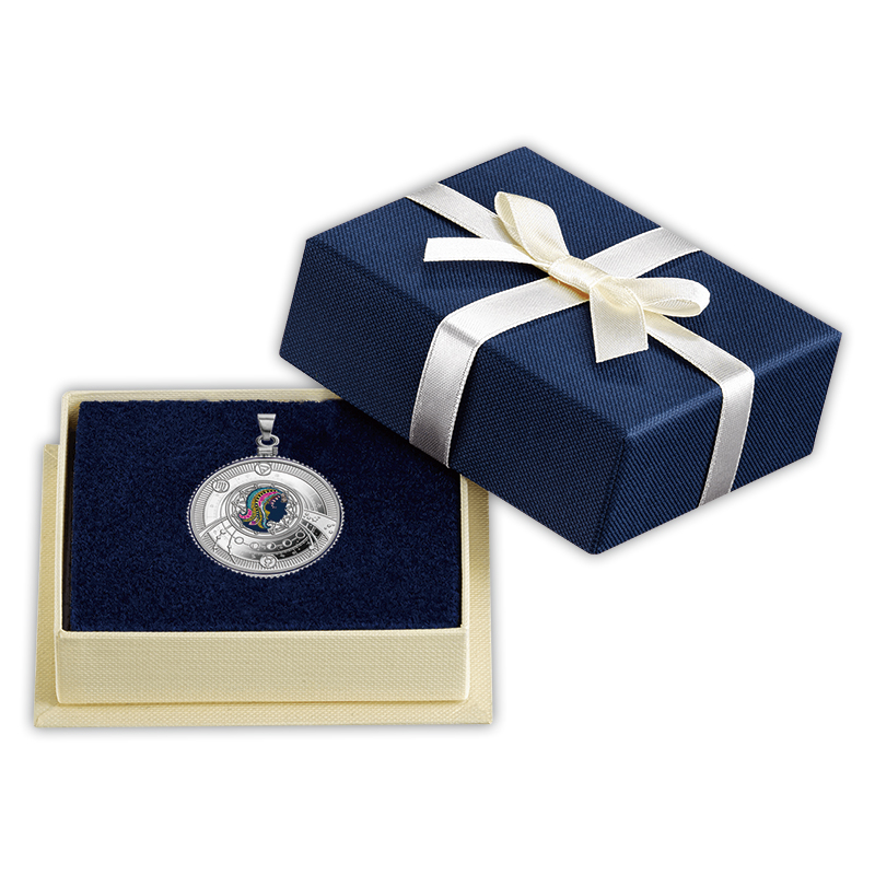 ポーランド造幣局の鋳造により、カメルーン共和国から発行。クラスプ(留め金)を使って、コインとエレガントなジュエリーが一つになったスタイリッシュなペンダントとしてご利用いただけます。