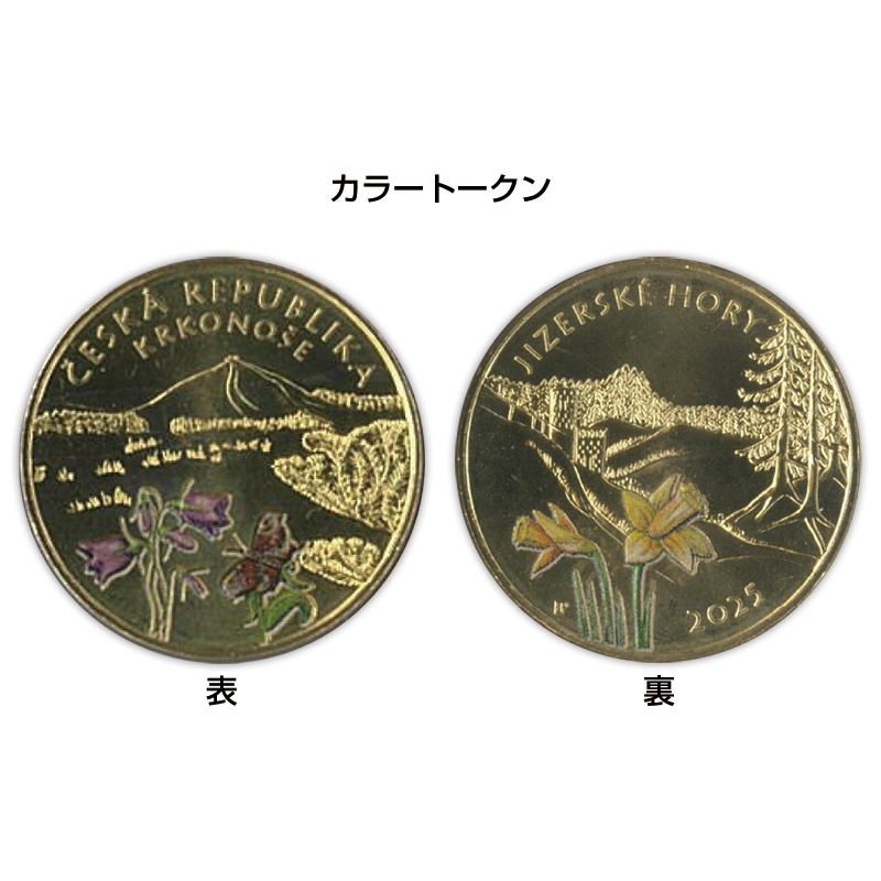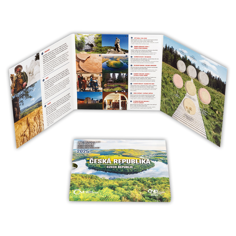 未使用の1、2、5、10、20、50コルナ貨の通常貨6種に加え、記念カラートークン(色付きのカラーメダル)も含まれています。セットは、チェコの写真や情報(チェコ語と英語の併記)を満載した折り畳みパッケージに収納されています。