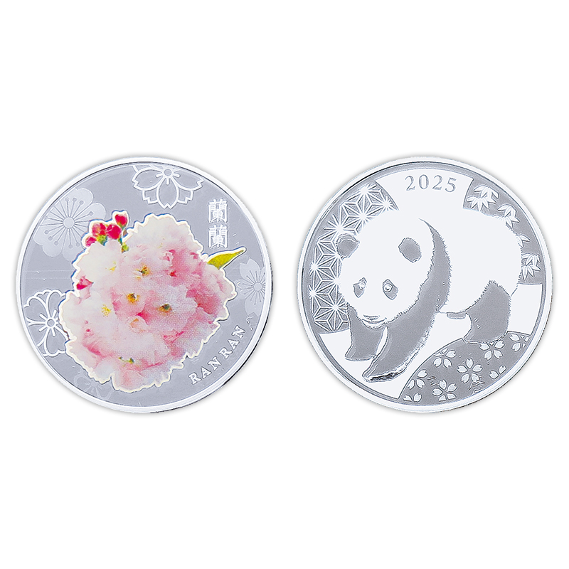 銀メダルの表面には令和7年“今年の花”、「蘭蘭(らんらん)」をカラー印刷。裏面には、「蘭蘭(らんらん)」にちなみ、パンダを和模様(竹、麻の葉、桜)とともにデザインしており、パンダの特徴である黒色と白色の毛並みを、2種類の異なる質感(光沢と梨地)にてレリーフ表現しています。
