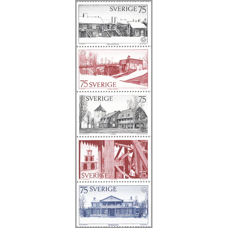 「エンゲルスベリ鉄工所」(スウェーデンの世界遺産)、ビスビの火薬庫ほかを描く。5種のうち4種がスラニアによる彫刻凹版切手。