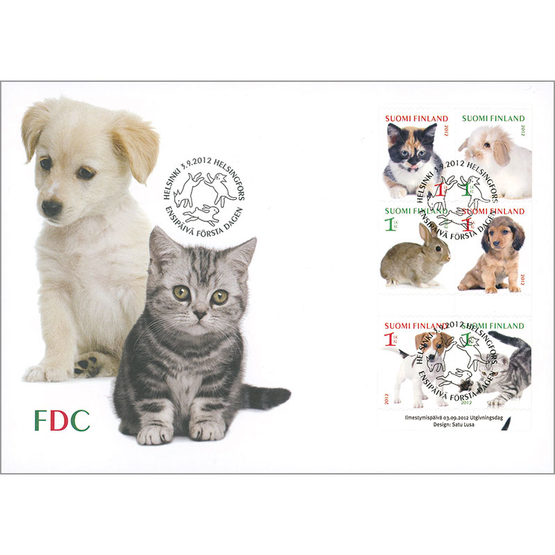 ヨーロピアン・ショートヘアー(ネコ)、ロップイヤー・ラビット(ウサギ)、ダックスフント(イヌ)ほかが図案のセルフ糊切手6種を収めるペーンのFDC。