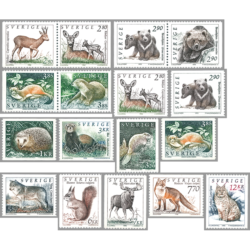 リス、オオカミ、ヤマネコ、ナミハリネズミ、オコジョほかを描く。目打での分類を含めた17種。