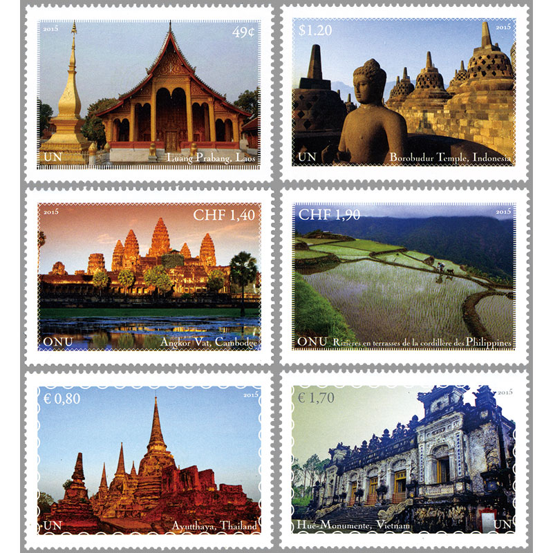 ルアン・パバンの町(ラオス)、ボロブドゥル寺院遺跡群(インドネシア)、アンコール(カンボジア)ほかが図案。
