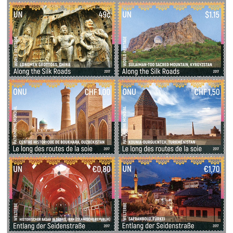 ブハラ歴史地区(ウズベキスタン)、クニヤ-ウルゲンチ(トルクメニスタン)、サフランボル市街(トルコ)ほかが図案。