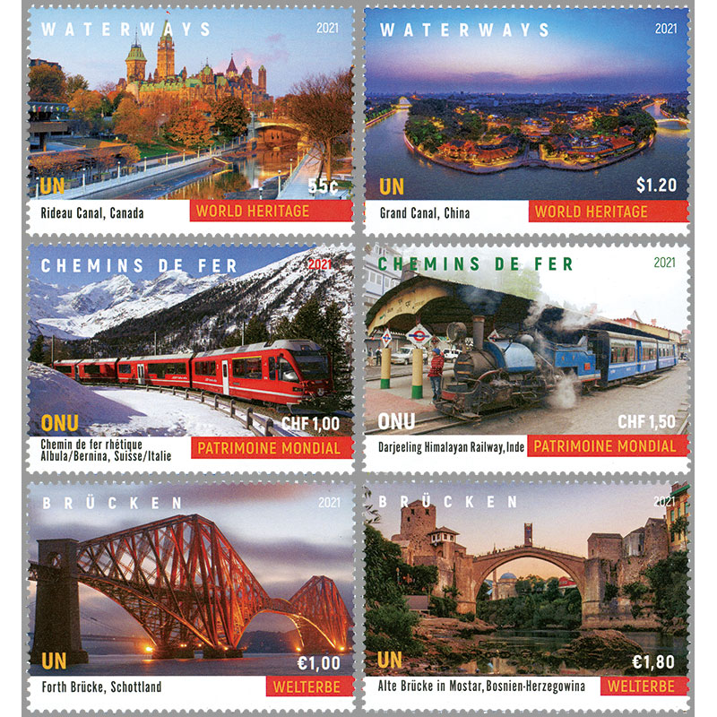 リドー運河(カナダ)、レーティシュ鉄道アルブラ線・ベルニナ線と周辺の景観(スイス、イタリア)、ダージリン・ヒマラヤ鉄道(インド)ほかが図案。
